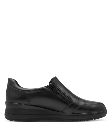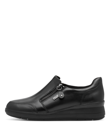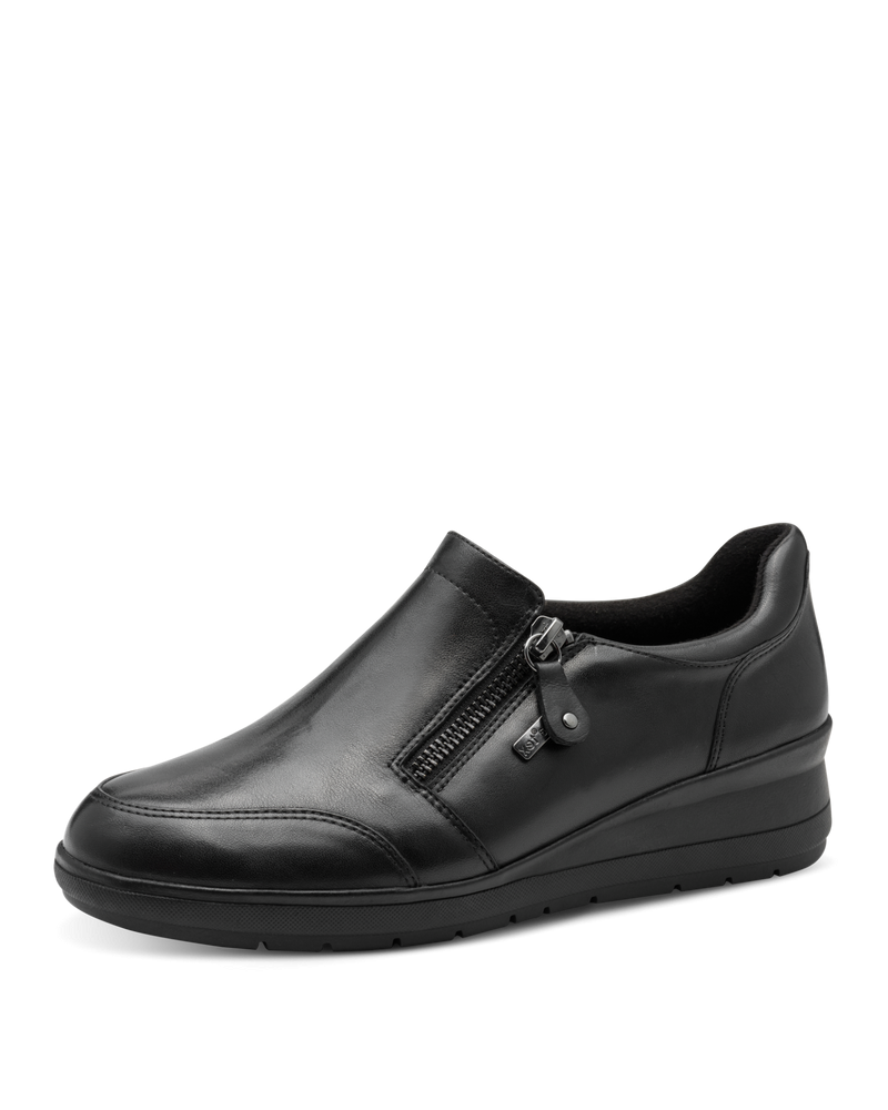 Skoen er en stilren og komfortabel hverdagssko i sort skind med praktisk lynlås i siden. Den bløde indersål og rummelige pasform (H-vidde) giver optimal komfort hele dagen, mens den vandafvisende Jana-Tex membran holder fødderne tørre i al slags vejr. En perfekt kombination af funktion, kvalitet og tidløst design – ideel til dig, der vil have en behagelig sko med et elegant udtryk.